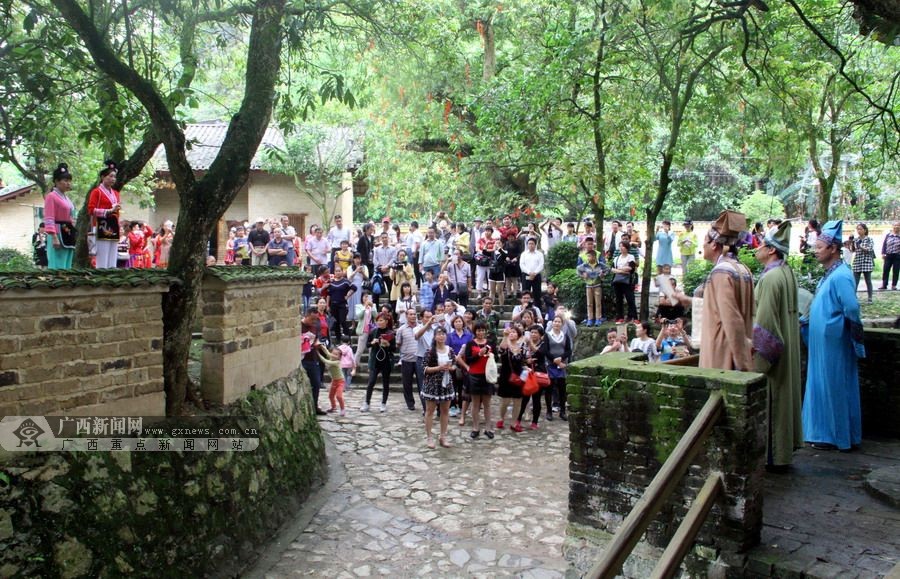 10日中午,到访河池的代表团一行,先来到著名壮族歌仙刘三姐的故乡--宜州市的壮古老风景区,赶山歌圩,欣赏那里正在举办的山歌比赛。接着,驱车来到宜州市著名的4A景区--刘三姐故里景区,游下枧河,跳竹竿舞,还参观了刘三姐故居,观赏了“刘三姐”与三“秀才”斗歌实景演出。在刘三姐歌台下,身着民族盛装的台湾阿美族“勇士”和“甜女”们,为游客现场表演了《赏月舞》、《勇士精神舞》等节目。他们的精彩表演,引来大家一片叫“好”声。