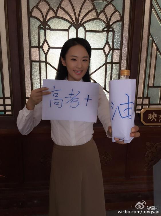 演员童瑶很实在的拖着一瓶油为考生助威。图片来源:童瑶认证微博