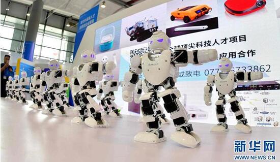 9月12日,智能机器人在南宁国际会展中心跳起“集体舞”。(图片来源:新华社记者黄孝邦)