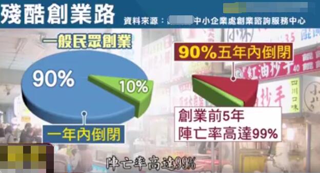 根据台湾“经济部中小企业处”统计,在台湾创业一年内就倒闭的机率高达九成;能撑过前五年的创业家,只有1%,99%的高“阵亡率”比美国、新加坡等地还恐怖。