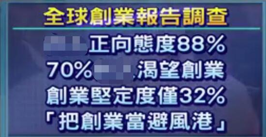 在台媒给出的另一份“全球创业报告调查”中我们还可以看到,全台对“创业”持正向态度的比例高达88%,有70%的人渴望创业,但对创业有“坚定度”的人仅有32%。