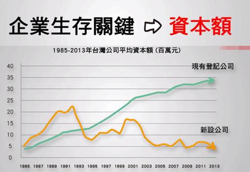 以上图为例,从1985年开始,台湾新创企业的资本额与现有企业的资本额相差无几,但从1996年开始,存活企业的资本额就不断的往上提高,2013年直逼3400万(新台币);反观新创企业的资本额却还在500万停留。换句话说,企业要想活,“银弹”就得足。