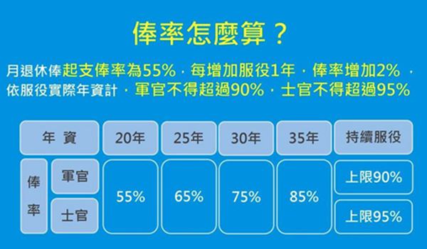 月退休俸起支俸率为55%,每增加服役1年,俸率增加2%,依服役实际年资计,军官不得超过90%,士官不得超过95%。