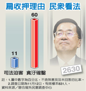 中国台湾网11月13日消息 台北地方法院合议庭裁定陈水扁收押禁见后,台湾《联合报》的民意调查发现,六成台湾民众认为陈水扁被收押是因为贪污事证确凿,仅一成一认为是司法迫害。