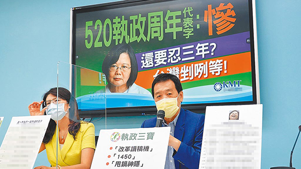 民进党当局连任后,从去年开放“莱猪”、关闭中天新闻台,到今年台铁太鲁阁号事故、兴达电厂接连跳电、疫情严峻疫苗数量却不足等,引发台湾民怨沸腾。国民党中央昨日盘整民进党当局这一年来施政表现,直指“缺水、缺电、缺疫苗、黑道执政、食安破功”已成为民进党施政最鲜明的印象。