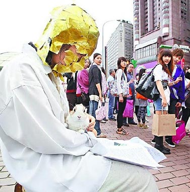 中国台湾网10月26日消息 据台湾《苹果日报》报道,继用猪血在马路上写字引发争议后,台湾艺术大学学生王思涵昨再度上演街头行为艺术,王思涵在脸上和头发上涂满蜂蜜,再黏上金色纸片,怀里抱着一只小兔子,独坐在台北巿人行道上,很多人直呼看不懂。
