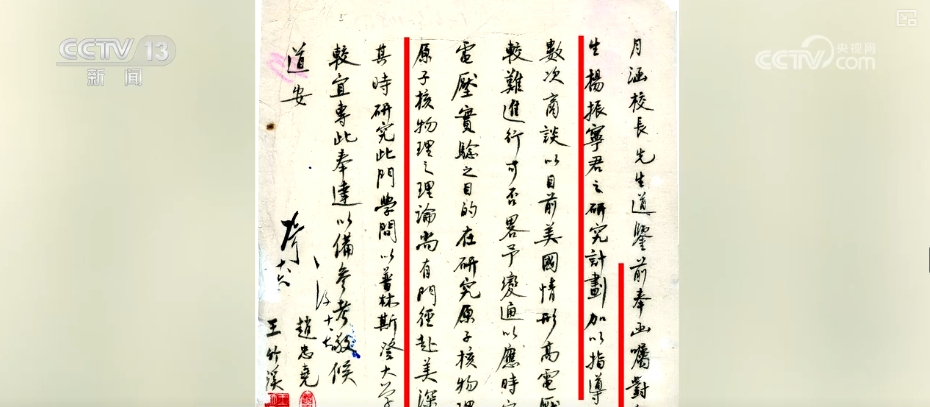 “前奉函嘱对留美公费生杨振宁君之研究计划加以指导……杨君对原子核物理之理论尚有门径,赴美深造适得其时。”这封信是20世纪40年代西南联大时期,清华大学物理系教授赵忠尧、王竹溪写给校长梅贻琦关于杨振宁培养意见的回信,推荐杨振宁去普林斯顿大学深造。信上有赵忠尧、王竹溪的签名盖章,还有梅贻琦手写的一个琦字,记载了清华大学一段重要的办学史和留学史。