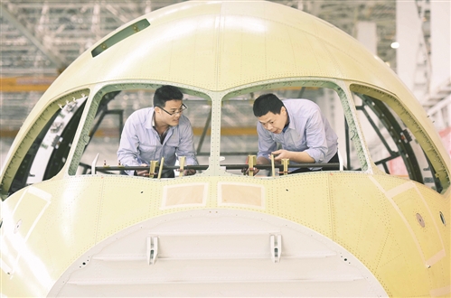 在四川成都,中航成飞民用飞机有限责任公司C919国产大飞机机头生产线工人在装配驾驶舱风挡。 新华社记者 刘 坤摄