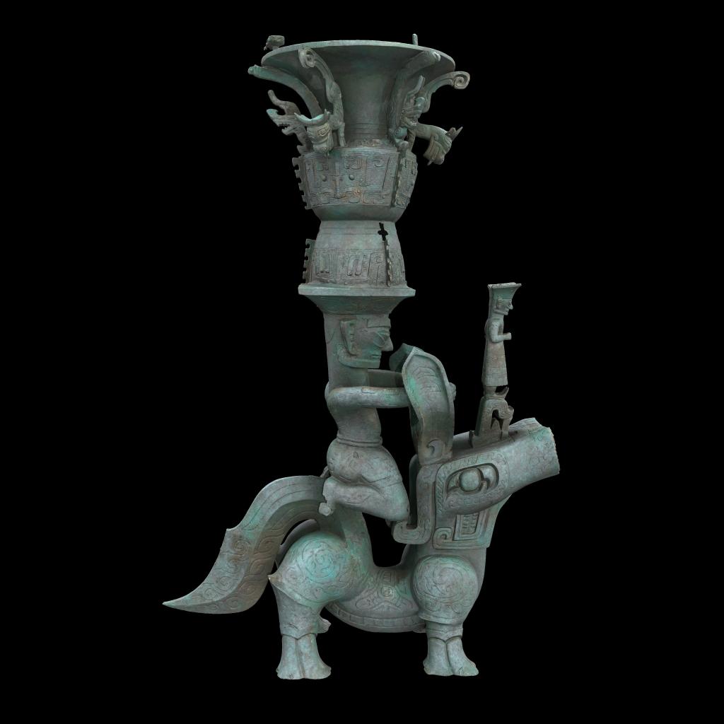 唐飞认为,这组青铜器表现了一个祭祀场景,跪在神兽背上的应是巫者身份,跪立是古蜀礼神最虔诚的姿势。站立在神兽头顶的铜人,或许象征古蜀王者。巫者头顶的铜尊具有中原文化风格,推测祭祀中尊内应盛有海贝、玉、酒之类的祭品。