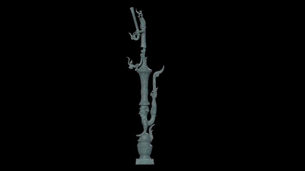 复原完成的铜罍座倒立鸟足顶尊神像通高2.53米,主要由铜罍、神像和人像构成,由2号“祭祀坑”的铜鸟足人像、3号“祭祀坑”的爬龙铜器盖、8号“祭祀坑”的铜顶尊撑罍曲身人像、铜持龙立人像、铜杖形器五个部分拼接而成。这件青铜器主体是一尊倒立的神像,纵目突出,獠牙外露,头顶尊、手撑罍、脚踏鸟,身体向后翻起,双腿肌肉健壮有力,双足则化为鸟爪形,显然是神而非人。