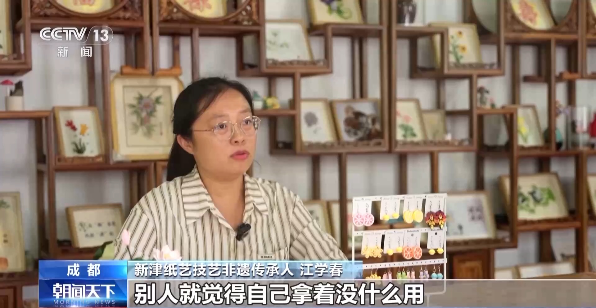 新津纸艺技艺非遗传承人 江学春:我们之前全部做的是平面的,别人就认为自己拿着没什么用,然后就有人建议我可不可以做一些实用性比较强的。
