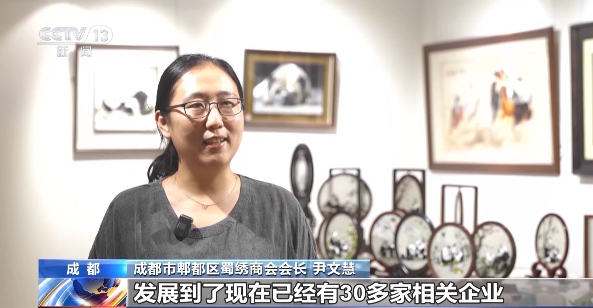 成都市郫都区蜀绣商会会长 尹文慧:我们蜀绣基地由最初的几家绣坊,发展到有30多家相关企业,由最初几十位绣娘,发展到现在上千人的生产规模。产值产能也是越来越大,以前一年有二三百万元收入,到现在产值已经达到上亿元的规模。