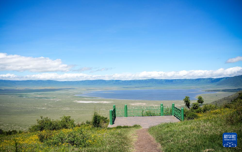 站在火山口一处新建的观景平台俯瞰,广袤的谷底恰似一幅徐徐展开的自然画卷:在雨后的蓝天白云映衬下,澄澈的湖泊宛若宝石般镶嵌在草原上;成群的角马、斑马与羚羊等野生动物化作一个个黑点,如同律动的音符,在天地间奏响着一曲原始而壮美的生命乐章。