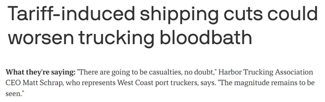 港口卡车运输协会首席执行官马特·施拉普表示,关税政策若继续下去,将严重影响整个物流行业,“卡车公司将失去业务,仓库也没有存储业务,甚至连码头装卸工也没有那么多工作了”。