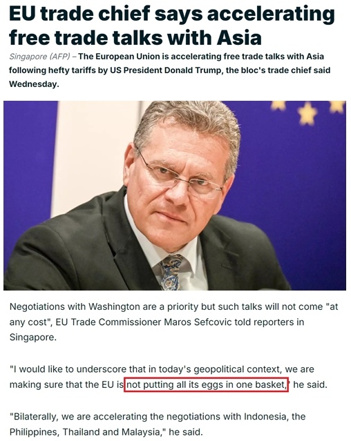 他表示,虽然与美国的谈判是优先事项,但欧盟不会为了谈判不计代价,“在当今的地缘政治背景下,我们要确保不把所有鸡蛋都放在一个篮子里”。