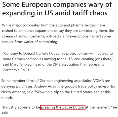 德国机械设备制造业联合会北美贸易政策顾问安德鲁·阿代尔表示,该联合会的一些成员公司已推迟采购活动,“似乎正在按下暂停键”。