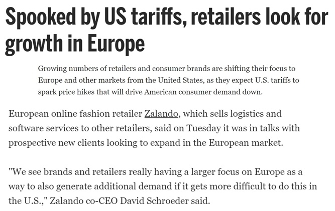 与此同时,由于预计关税将引发价格上涨、压低美国消费需求,越来越多的欧洲零售商和消费品牌也在将重心从美国转向欧洲和其他市场。