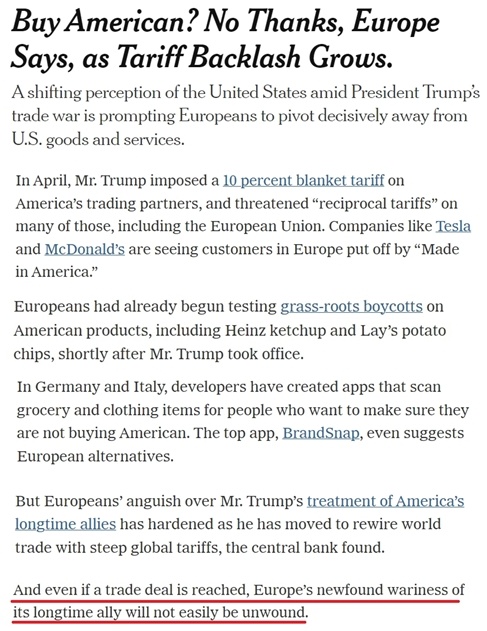 报道认为,由于本届美国政府对待盟友的方式给欧洲造成了不断加剧的痛苦,即使双方日后达成贸易协议,欧洲对美国新萌生的戒心也很难轻易消除。