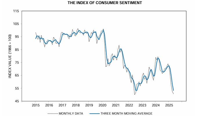 △2015年5月至2025年5月,美国消费者信心指数。图片来源:美国密歇根大学