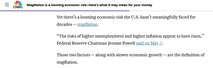 △美国消费者商业与新闻频道近期发表文章指出:一个迫在眉睫的经济风险——滞胀已经初现端倪。而美国几十年来一直没有真正面对。
