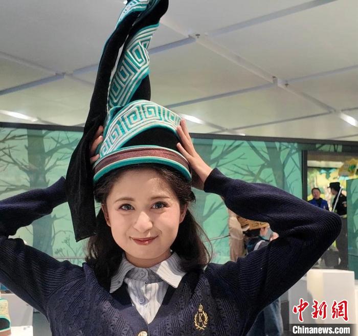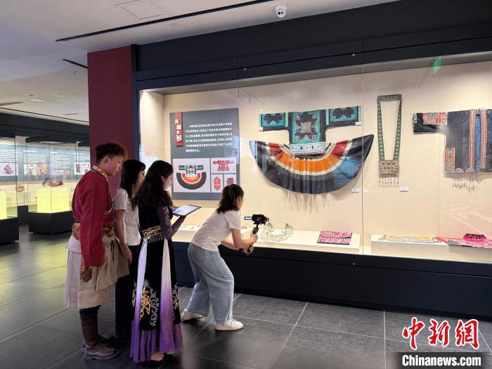 5月15日,迪拉热·阿地力江与同学在西南民族大学民族博物馆拍摄民族服饰。 中新网记者 贺劭清 摄