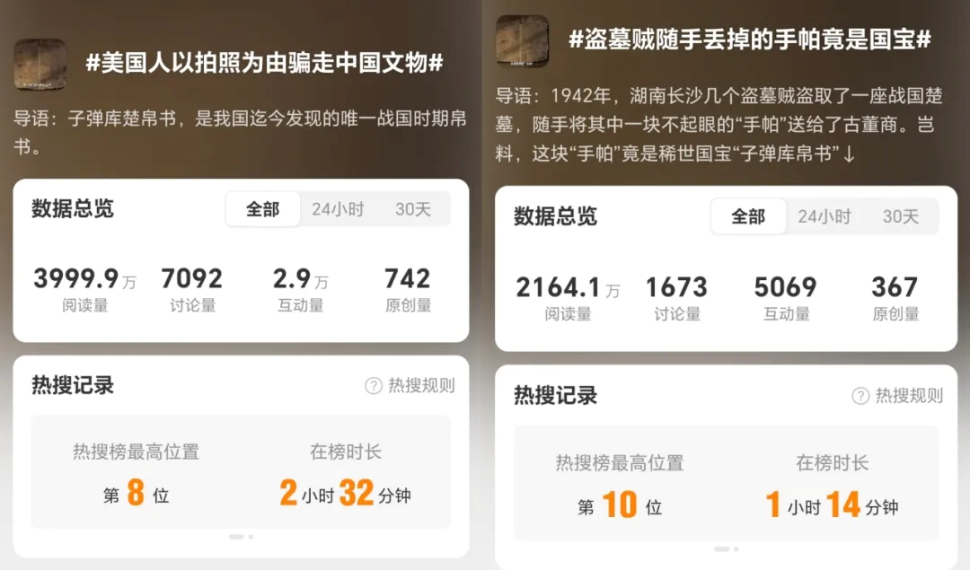 《帛书传奇》开播后,在总台央视综合频道黄金时段首播平均收视率0.73%,累计观众规模8789.8万人,相关内容全网触达人次达10.26亿,相关话题69次登上热搜热榜,话题阅读量累计3.8亿人次,节目播出首日位列晚间黄金档网民评议度第一。#美国人以拍照为由骗走中国文物#登上微博热搜榜第8位,社会榜第3位,#盗墓贼随手丢掉的手帕竟是国宝#登上微博热搜榜第10位,社会榜第9位。
