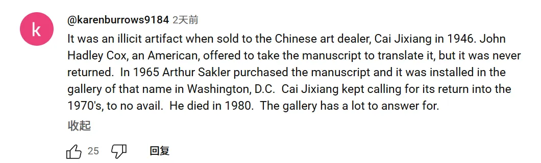 英语网友凯伦·巴洛斯评论:“美国人柯强提出将子弹库帛书借去翻译,但此后再也没有归还。1965年,阿瑟·赛克勒购得帛书,并将其陈列于华盛顿特区以他名字命名的画廊中。蔡季襄直至20世纪70年代仍在持续追索帛书,却始终无果。赛克勒画廊对此负有不可推卸的责任。”