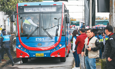 图为在厄瓜多尔首都基多,人们体验宇通双源无轨电车。