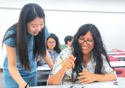 图为在秘鲁利马,秘鲁天主教大学孔子学院中文教师梁卿(左)辅导秘鲁学生写书法。
