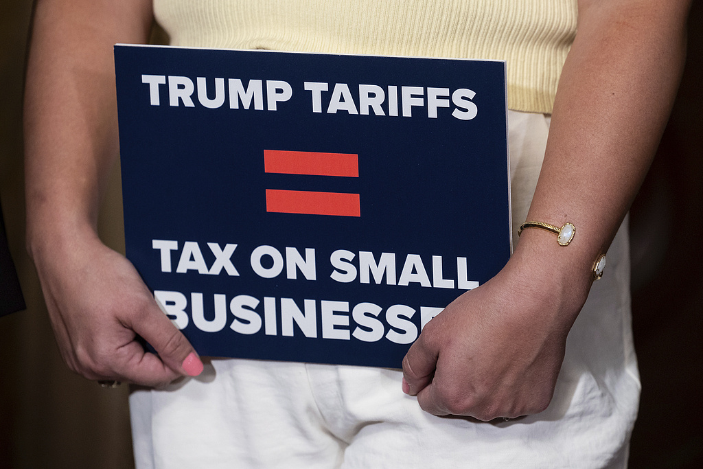当地时间2025年5月5日,美国国会就关税政策对小型企业的影响举行发布会。发布会上有人手持写有“特朗普关税=对小型企业的税”的标语(图自视觉中国)