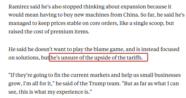 一家墨西哥风味甜品店店主则表示,通常自己所有“不易腐烂”的原材料都来自中国。145%的关税让他转向了美国本土供应商,但后者的价格更贵,且提供的是非定制产品。他告诉《商业内幕》,自己已经暂停了开新店的计划,因为这意味着需要从中国进口新的机器和原材料。自己目前只能保证核心单品不涨价,但已提高了精品产品的价格。