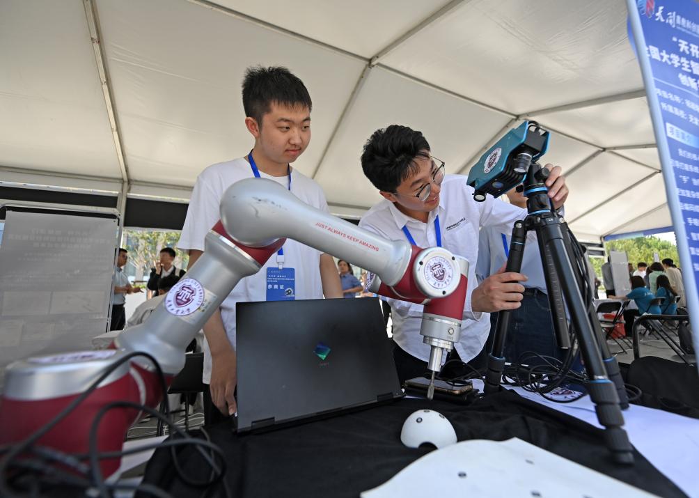 2024年5月,参加“天开杯”创聚津门全国大学生智能科技创新创业挑战赛的天津工业大学学生在调试参赛产品。(新华社记者赵子硕 摄)
