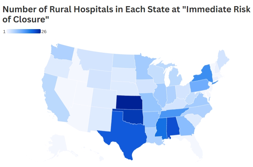然而,美国医疗质量与支付改革中心(Center for Healthcare Quality and Payment Reform)指出,由于持续的财务亏损和低现金储备,全美近三分之一的农村医院已面临倒闭危险,这意味着医疗补助计划的削减可能会导致这些医疗机构关门。关闭医院数量最多的州包括堪萨斯州、俄克拉荷马州和亚拉巴马州。此外,俄克拉荷马州和纽约州几乎每三家农村医院中就有一家可能关闭,宾夕法尼亚州和弗吉尼亚州则约为每四家就有一家。