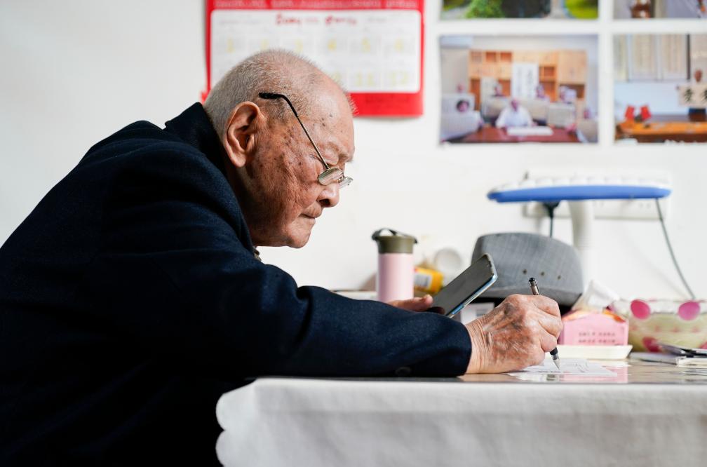 ↑在四川省南充市五福堂颐养院,刘寿山抄录手机上的新闻信息(4月9日摄)。