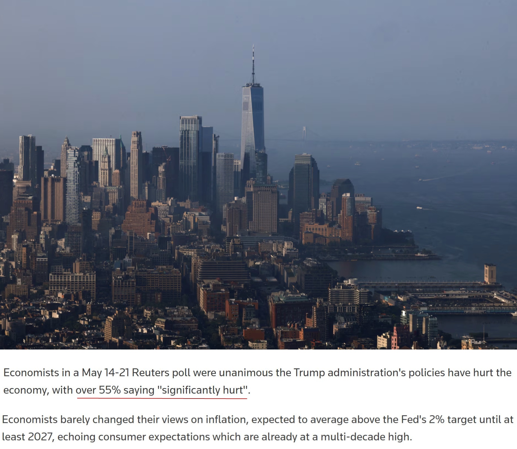 美国政府4月10日宣布暂缓对部分贸易伙伴征收“对等关税”90天的期限即将过半,路透社近日公布的面向经济学家的最新民调显示,受访经济学家一致认为,白宫的相关政策对美国经济造成了负面影响,其中超过55%认为“造成了重大伤害”。