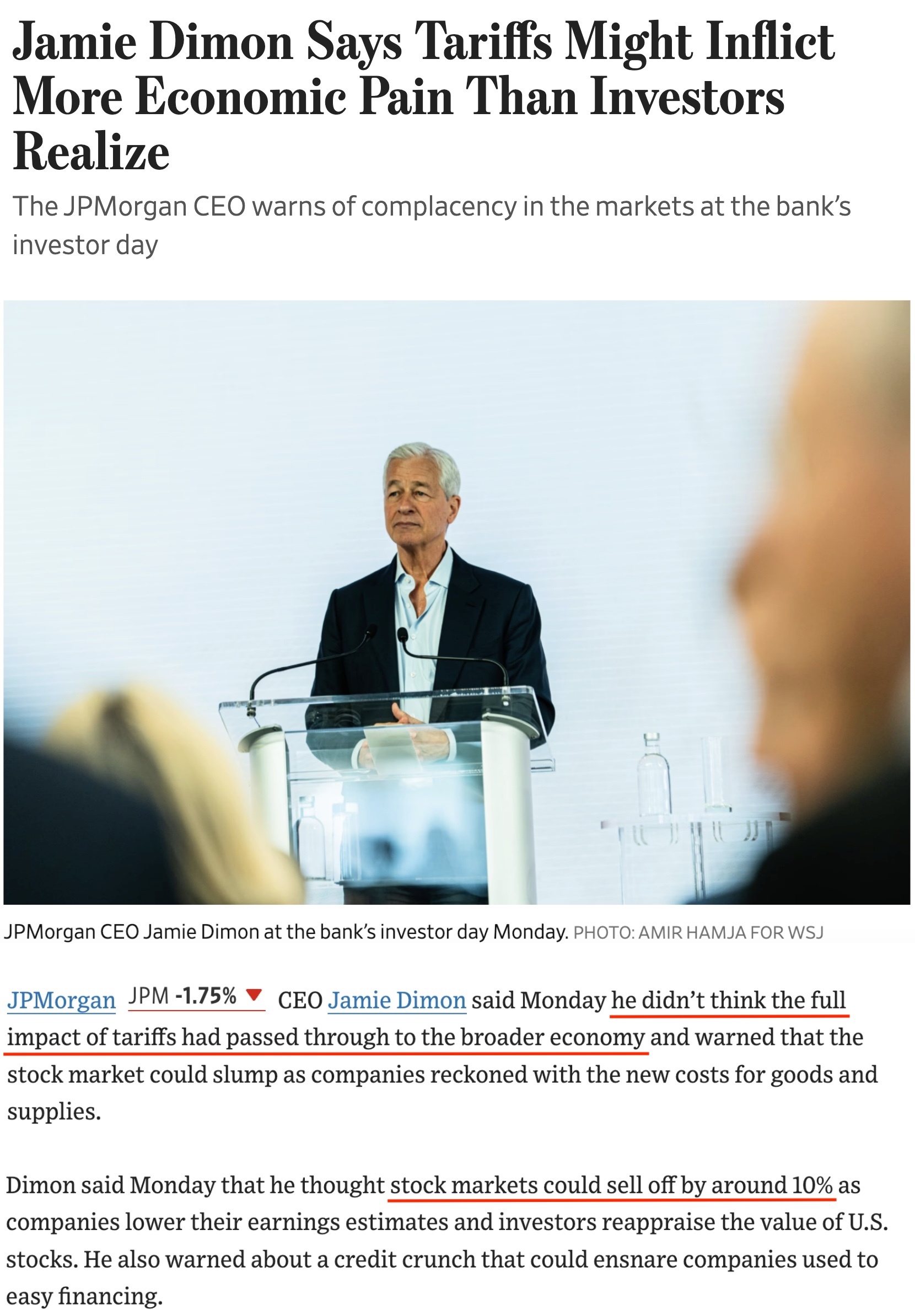 摩根大通公司首席执行官杰米·戴蒙近日指出,关税的全部影响尚未传导至整体经济,通胀加剧和滞胀的可能性比人们认为的要大,随着企业下调利润预期以及投资者重新评估美国股票的价值,股市可能下跌约10%。