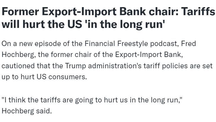 美国进出口银行前行长弗雷德·霍奇伯格也曾警告称,美国政府的关税政策将对美国经济和消费者造成长期伤害。