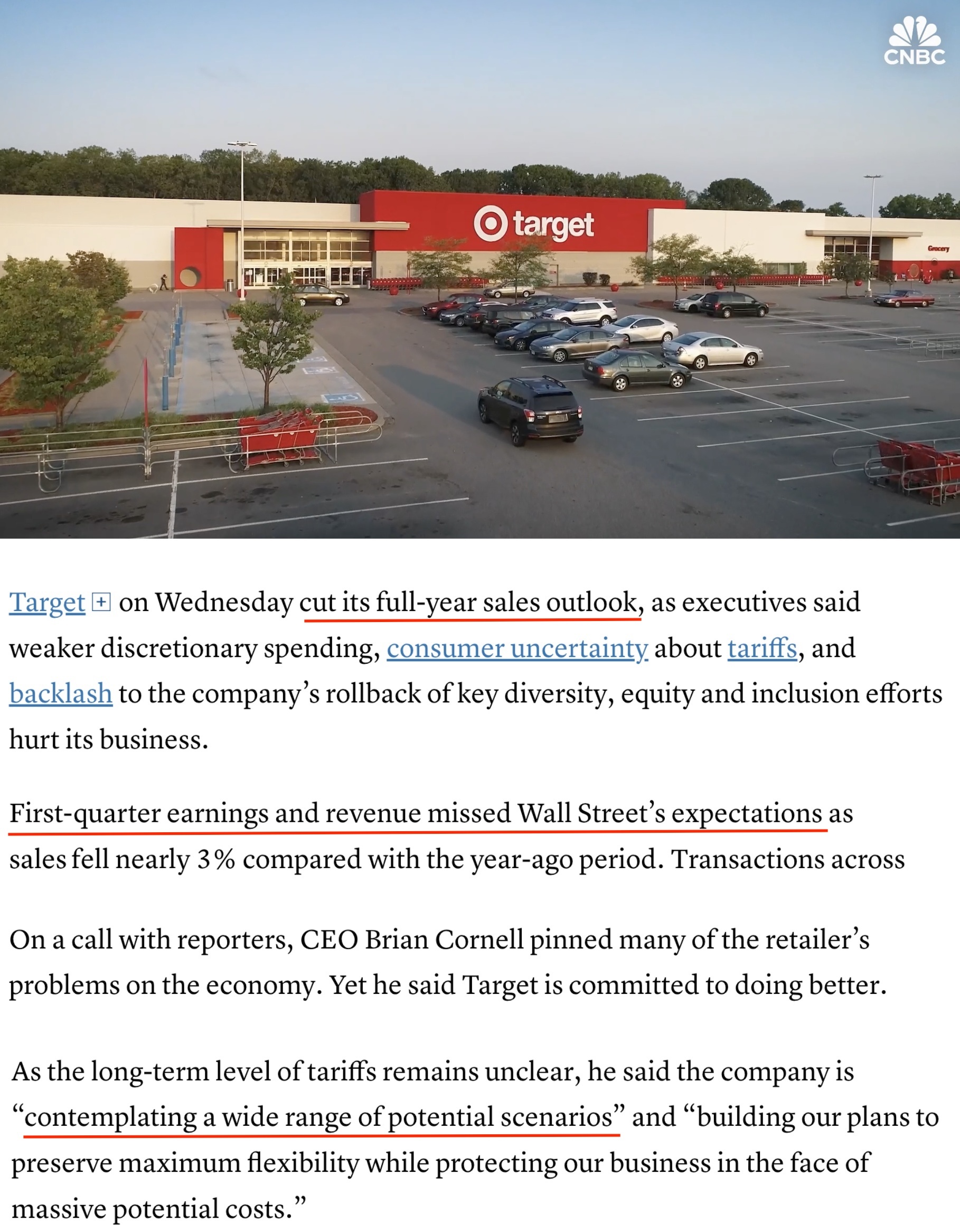 美国知名零售商塔吉特百货公司第一季度的收益和收入均低于预期。由于业务受到关税的不确定性等因素损害,该公司21日下调了全年销售预期。