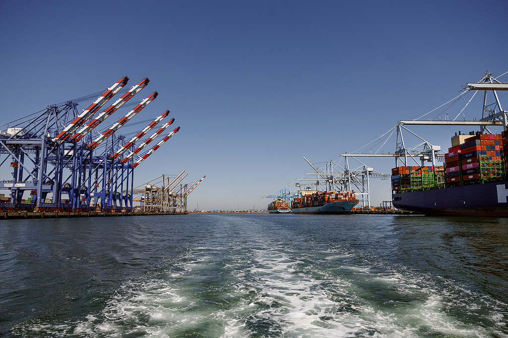 △当地时间2025年5月9日,美国加州洛杉矶港,左侧通常繁忙的码头现在却集装箱稀少。(图自视觉中国)