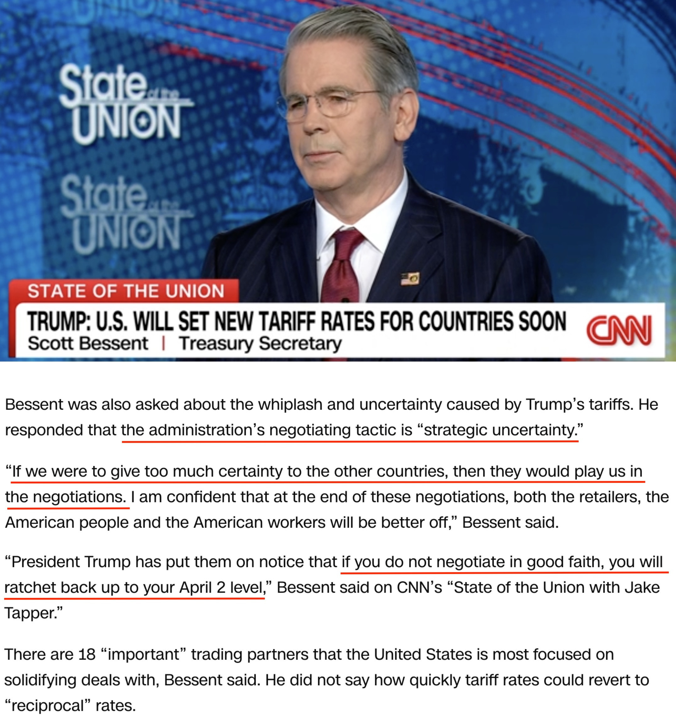 贝森特表示,美国政府正专注于与18个最重要的贸易伙伴,如果对方没有“诚意”,他们的关税税率将回到4月2日的“对等”水平。