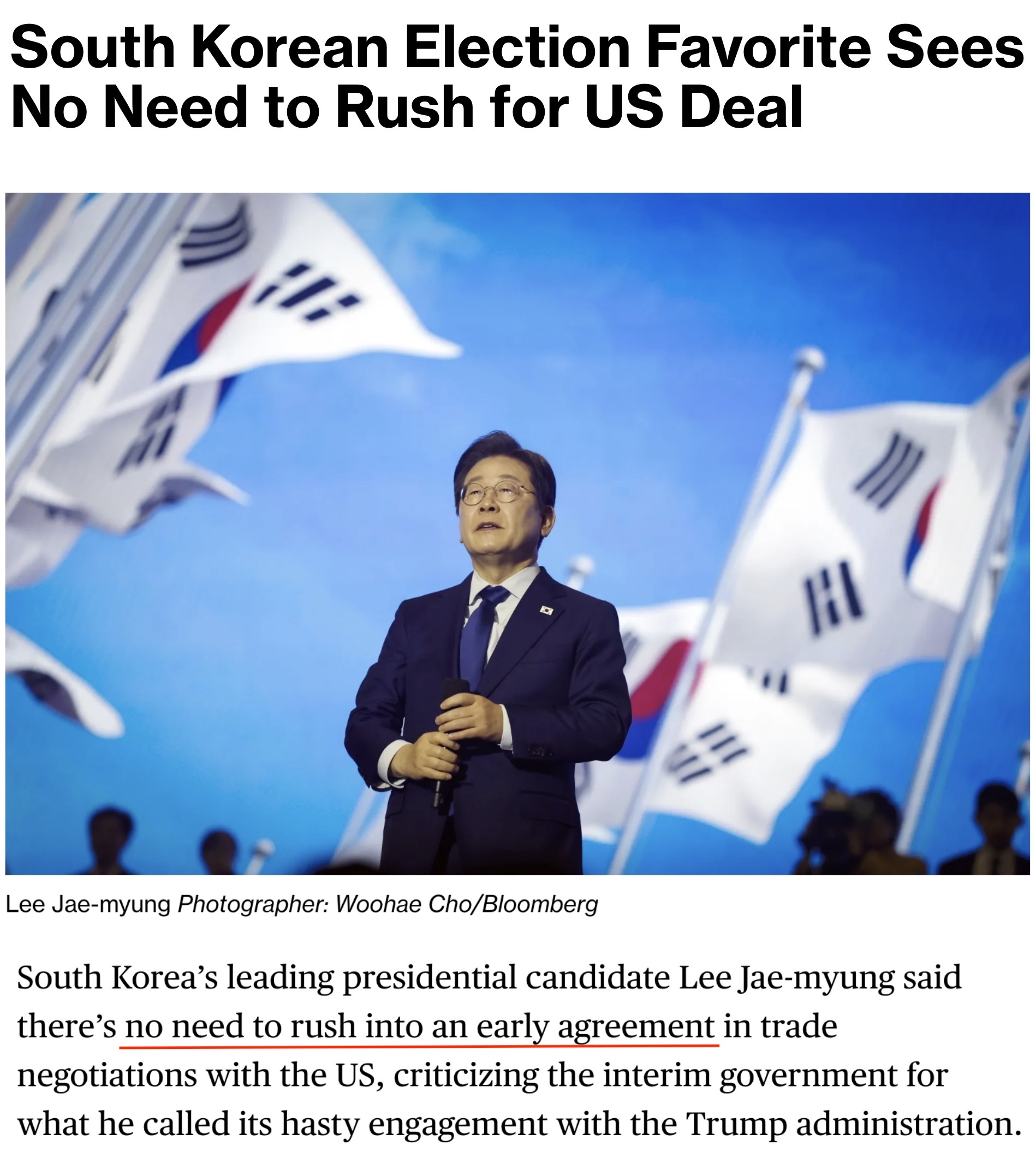彭博社指出,尽管官员们不愿公开表示他们的态度变得强硬,但有迹象表明,一些国家已经意识到手中的牌比之前认为的多,因此可以放慢谈判的步伐。比如目前韩国民调领先的总统候选人李在明就表示,没必要急于与美国达成贸易协议。