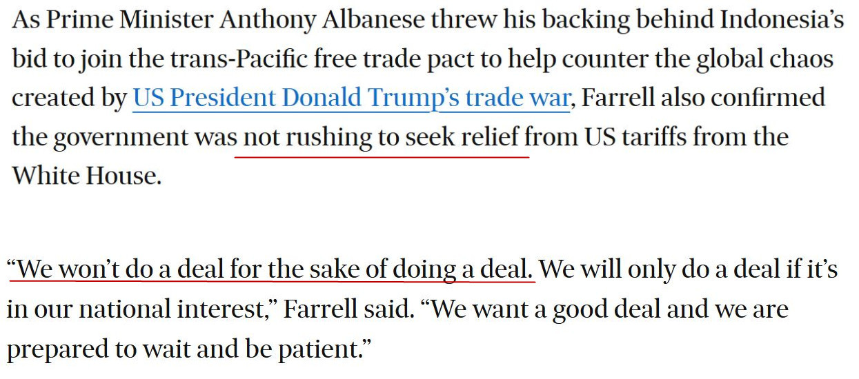 澳大利亚贸易部长法瑞尔近期也公开表示,澳大利亚政府不急于向美国方面寻求关税减免。
