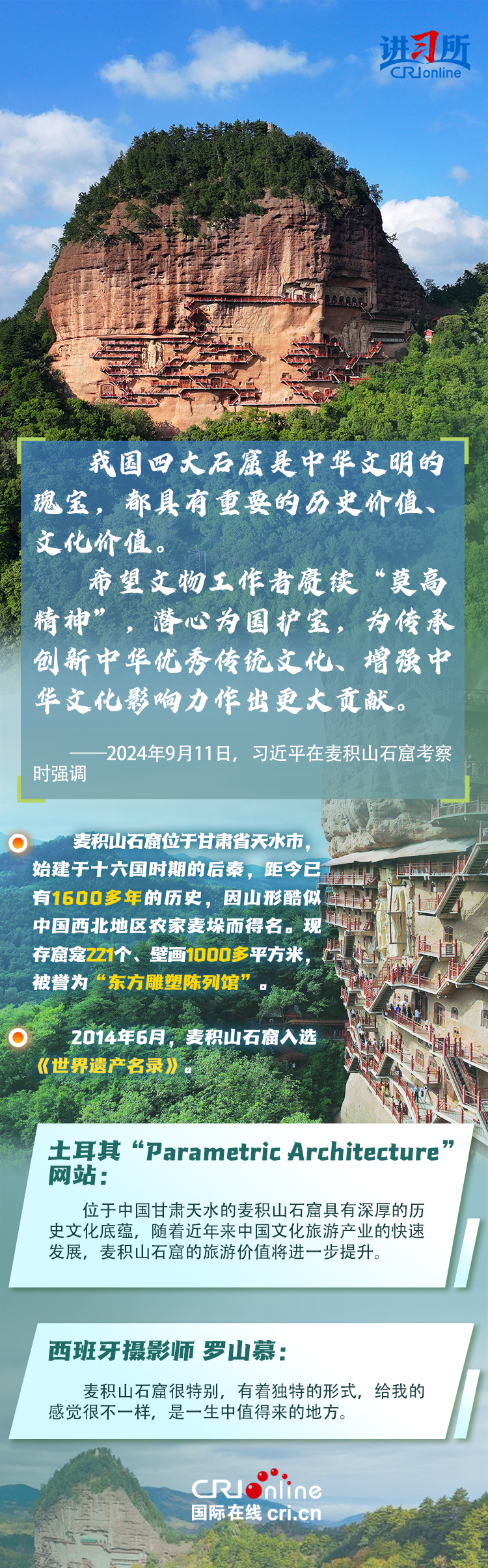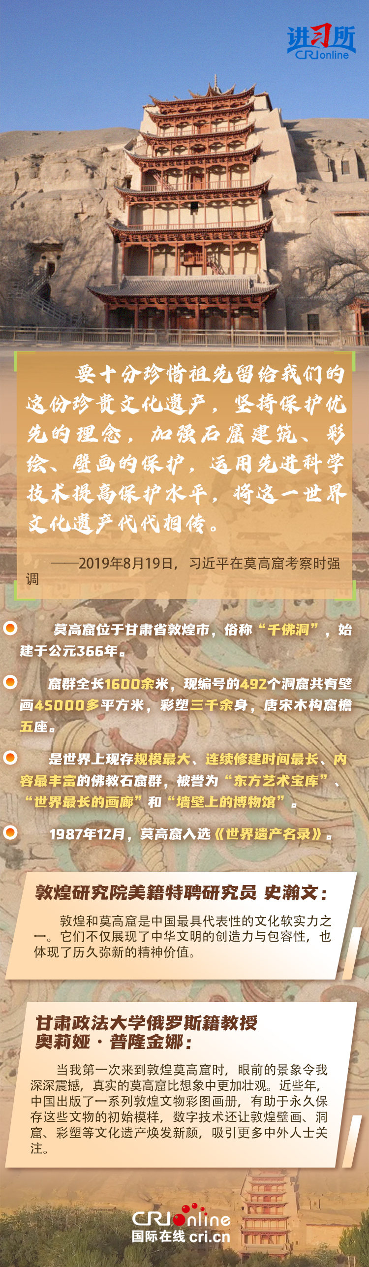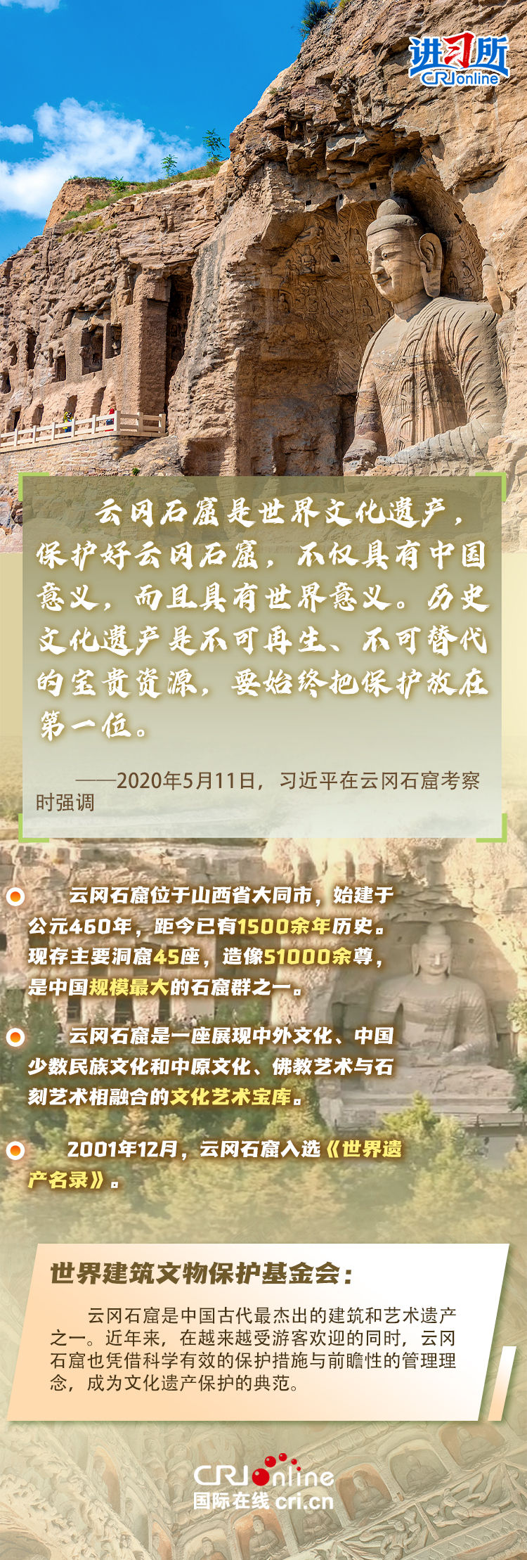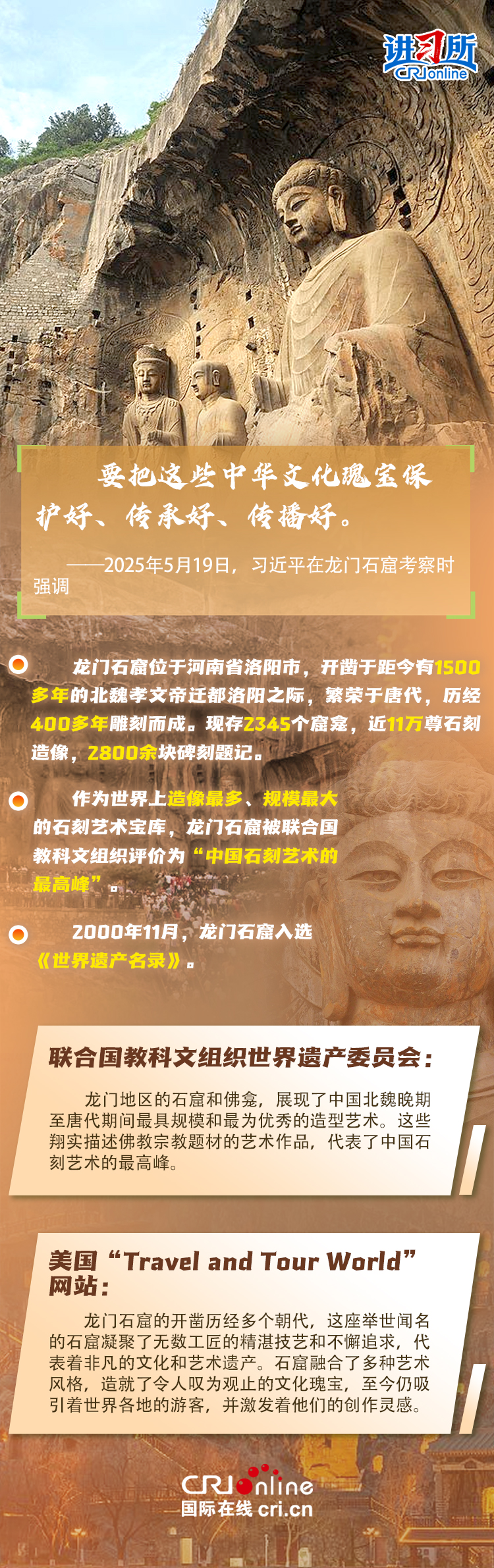 龙门石窟被联合国教科文组织评价为“中国石刻艺术的最高峰”,与敦煌莫高窟、云冈石窟、麦积山石窟并称为“中国四大石窟”,具有重要历史价值、文化价值。近年来,习近平先后考察了中国四大石窟。对这些承载着中华民族文化基因和血脉的文物和文化遗产,习近平强调,“保护好、传承好历史文化遗产是对历史负责、对人民负责。”