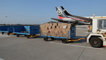 6月29日清晨,在西安咸阳国际机场,从广州运来的荔枝快件被工作人员搬下飞机。