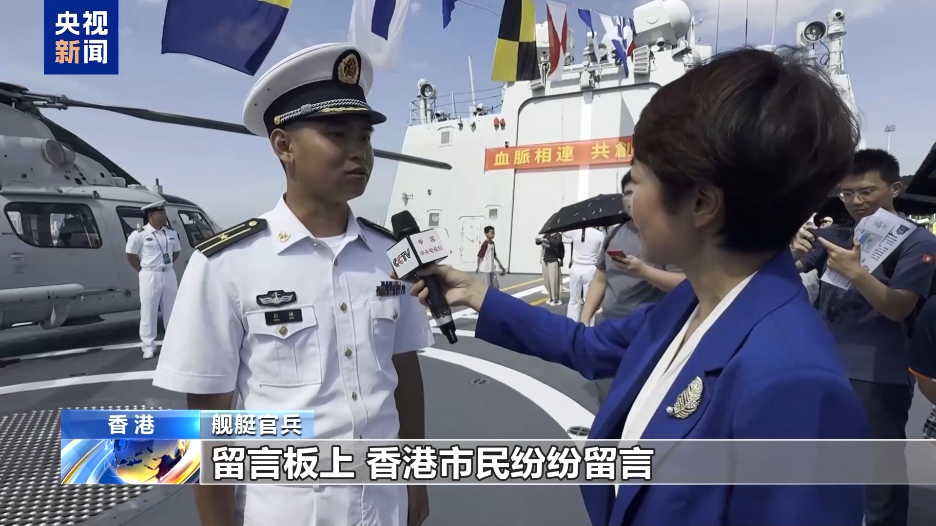 舰艇官兵:我随舰第一次来香港,感受最深的是后面的留言板。香港市民纷纷在留言板上留言。我看到很多关于祝福国家强大、祝福人民海军的字句,我看到之后非常激动,也难掩心中自豪。