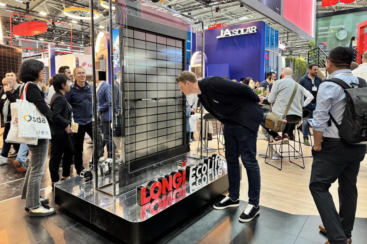 5月8日,参观者在德国慕尼黑举行的2025年欧洲国际太阳能展上参观隆基绿能展区。(图片来源:新华社)