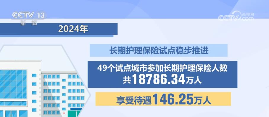 2024年,长期护理保险试点稳步推进,49个试点城市参加长期护理保险人数共18786.34万人,享受待遇146.25万人。