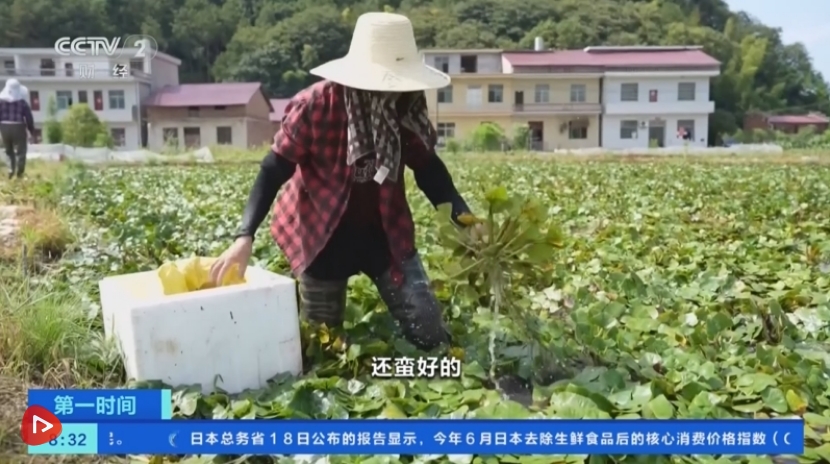 箬坑村种植的“大青菱”从7月初开采,采摘期持续到11月中旬,亩产约2000斤,高峰期每天可采摘1.5万斤,预计全年总产量超200万斤。