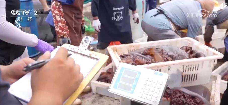 在南渔港码头,渔船刚一停靠,渔民们便争分夺秒地卸货、称重。今年,在烟台龙口海蜇专项捕捞期,共有41艘渔船成功办理了海蜇专项捕捞许可证,得以出海作业。