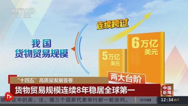 央视网消息:“十四五”期间,中国外贸在全球变局中逆势上扬,顶住压力、稳中提质。五年来,不仅“做大了体量”,也“做强了结构”,更“锻造了韧性”,贸易强国建设步伐加快。